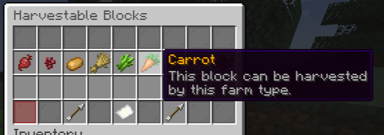Whereas the section name carrots is the material of the block when placed. Alternatively, you can specify a block option to define the block. item is the item that is being planted. harvest contains a list of items that are harvested each time a crop is read to be harvested. min and max define the minimum and maximum amount of items of this type given when harvested by the farm.